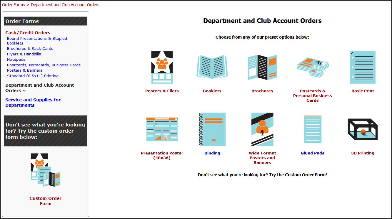 - Choose an order form. You can order using several pre-set Quick Forms for basic print items. If the quick order forms don’t include the options you are looking for, use the Custom Order Form to customize your order to your exact specifications.