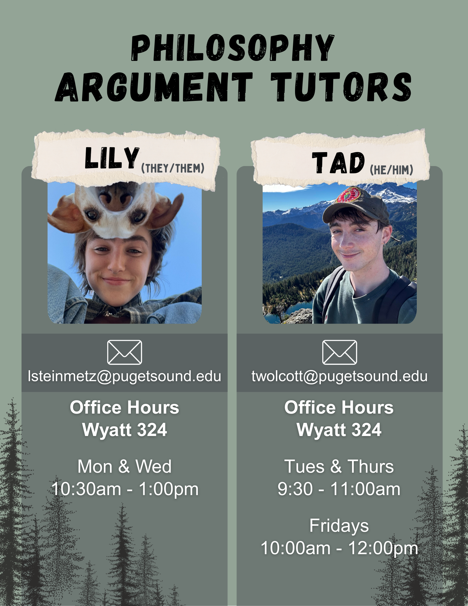 Lily (they/them) lsteinmetz@pugetsound.edu | Office hours (Wyatt 324): Mon & Wed 10:30 a.m.- 1 p.m.