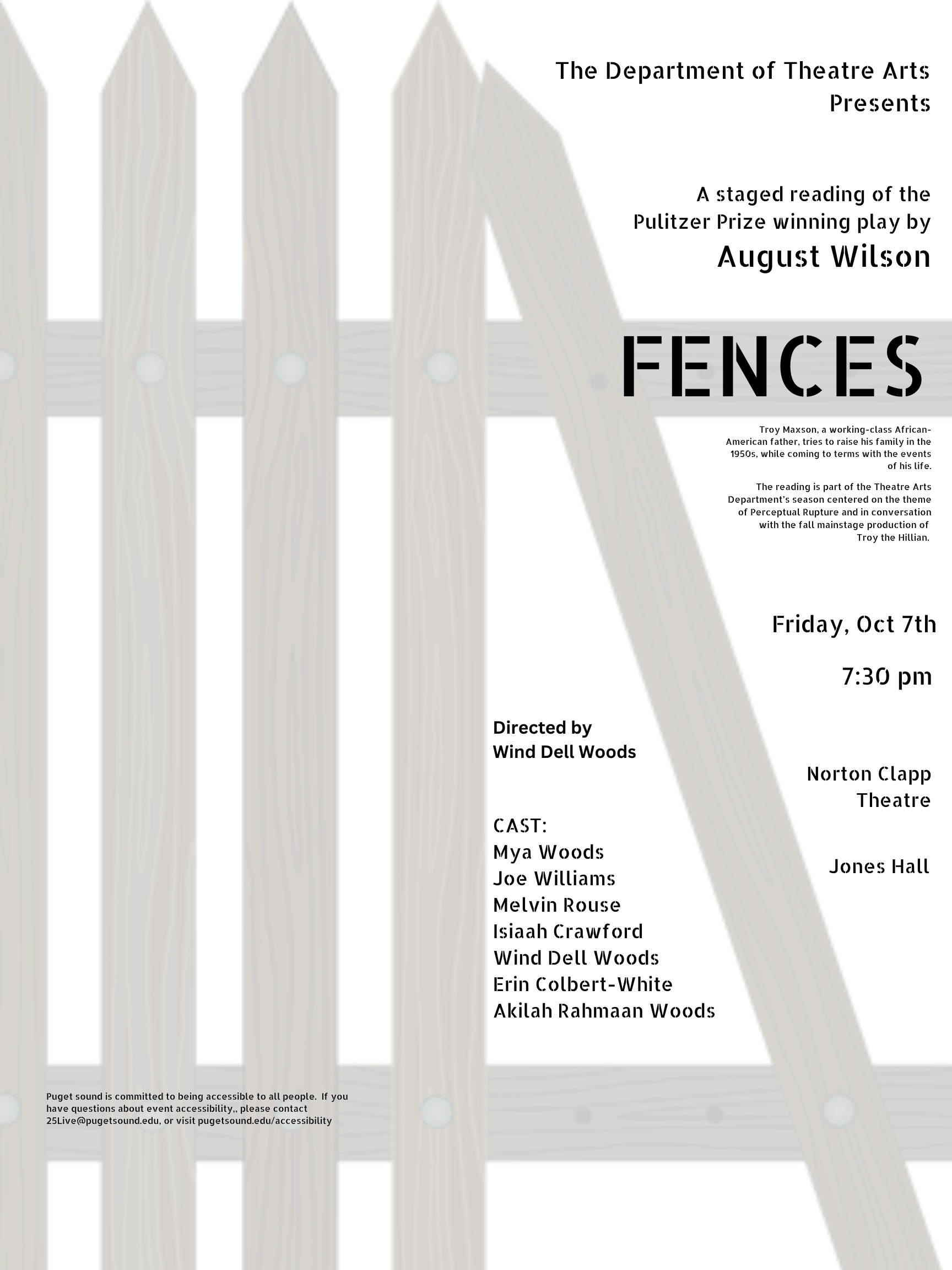 As a prelude to the upcoming Troy the Hillian, in which we refer to August Wilson's magnificent Fences, we are featuring a staged reading of the play. Campus faculty, students, and administrators have generously donated their time to participate in the reading in Norton Clapp Theatre.