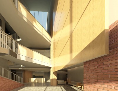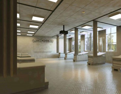 Photos on page: Top right: Center for Health Sciences under construction south end, May 2011, by Ross Mulhausen; top left: Bill Weyerhaeuser; above right: center under construction, east side, May 2011, by Ross Mulhausen; above left: Orthoclinic rendering; above: Lobby rendering.