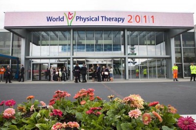 Photos: Top right: A 16th century illustration by Belgian anatomist Vesalius, with a weasel added by a student to illustrate pain due to trapezius tension. Top left: Cirque Du Soleil performs at the World Physical Therapy Congress. Bottom right: Entrance to the congress in Amsterdam. Bottom left: Trapezius muscle.
