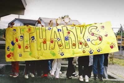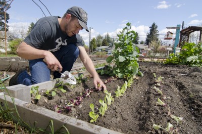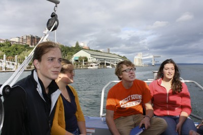Photos on page: Top right: Betty Popenuck '14 and Annie Bigalke '13 check campus garbage for recyclables in Garbology event; Top left: Students and local citizens take a sailing tour of the restoration of local waterways in classes held by Sound Policy Institute; Above right: Forest Beutel '11 works in the organic garden; Above left: Local teens thank Operatoin S.A.V.E. for recycled clothing, shoes and backpacks (courtesy of the Community Involvement and Action Center).