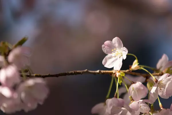 Yellow leaves hang off a branch with a red brick building in the background.