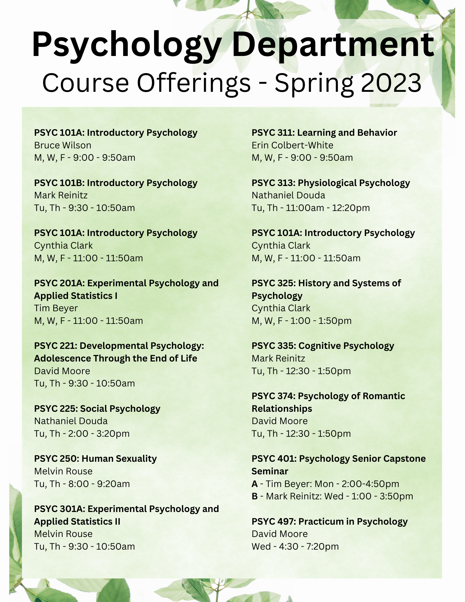 Psychology majors progress through a series of courses that engage them in a progressively deeper understanding of research methods, study development, and statistical data analysis to prepare them for conducting their own research. The psychology faculty and curriculum represent many of the major sub-disciplines in the field of psychology – including developmental, clinical, cognition, learning and behavior, sensation and perception, biopsychology, personality, and social psychology.